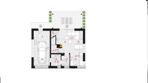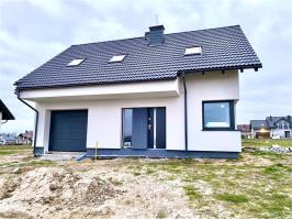Jednorodzinny dom wolnostojący w stanie deweloperkim z poddaszem użytkowym i jednostanowiskowym garażem w bryle. Budynek prezentuje się nowocześnie, charakter wykończenia z tynkiem w dwóch kolorach, dwuspadowy dach został wykończony dchówką betonową. Nad strefą wejściową zaprojektowano nowoczesne zadaszenie, a od strony ogrodu przewidziano pergolę, która przesłania taras. Dzięki racjonalnej organizacji powierzchni zapewniono mieszkańcom wygodę użytkowania domu. Szerokie przeszklenie w salonie efektownie otwiera wnętrze na ogród i taras, który powiększa przestrzeń wypoczynkową domu. W salonie zmieści się narożna sofa, wygospodarowano także miejsce na szafki lub komodę. Rodzinne posiłki w jadalni uprzyjemni widok na ogród, a otwarta kuchnia z narożnym oknem, optymalnym układem funkcji jest jasnym i wygodnym miejscem do pracy. W aranżacji parteru przewidziano także toaletę, a przestrzeń pod schodami można wykorzystać jako powierzchnię gospodarczą. Z wiatrołapu mieszkańcy mają dostęp do kotłowni którą możn przeranżowć jako pokój biurowy , to tu znajduje się przejście z domu do jednostanowiskowego garażu, który posiada od dodatkowe wejście zewnętrzne, od strony ogrodu. W części nocnej, na poddaszu, zaprojektowano cztery jasne i ustawne sypialnie z odpowiednią ilością miejsca na wygodne łóżka, biurka do nauki oraz szafy ubraniowe. Na osi schodów znajduje się łazienka z możliwością zamntowania wanny oraz prysznica.
