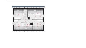 Jednorodzinny dom wolnostojący w stanie deweloperkim z poddaszem użytkowym i jednostanowiskowym garażem w bryle. Budynek prezentuje się nowocześnie, charakter wykończenia z tynkiem w dwóch kolorach, dwuspadowy dach został wykończony dchówką betonową. Nad strefą wejściową zaprojektowano nowoczesne zadaszenie, a od strony ogrodu przewidziano pergolę, która przesłania taras. Dzięki racjonalnej organizacji powierzchni zapewniono mieszkańcom wygodę użytkowania domu. Szerokie przeszklenie w salonie efektownie otwiera wnętrze na ogród i taras, który powiększa przestrzeń wypoczynkową domu. W salonie zmieści się narożna sofa, wygospodarowano także miejsce na szafki lub komodę. Rodzinne posiłki w jadalni uprzyjemni widok na ogród, a otwarta kuchnia z narożnym oknem, optymalnym układem funkcji jest jasnym i wygodnym miejscem do pracy. W aranżacji parteru przewidziano także toaletę, a przestrzeń pod schodami można wykorzystać jako powierzchnię gospodarczą. Z wiatrołapu mieszkańcy mają dostęp do kotłowni którą możn przeranżowć jako pokój biurowy , to tu znajduje się przejście z domu do jednostanowiskowego garażu, który posiada od dodatkowe wejście zewnętrzne, od strony ogrodu. W części nocnej, na poddaszu, zaprojektowano cztery jasne i ustawne sypialnie z odpowiednią ilością miejsca na wygodne łóżka, biurka do nauki oraz szafy ubraniowe. Na osi schodów znajduje się łazienka z możliwością zamntowania wanny oraz prysznica.